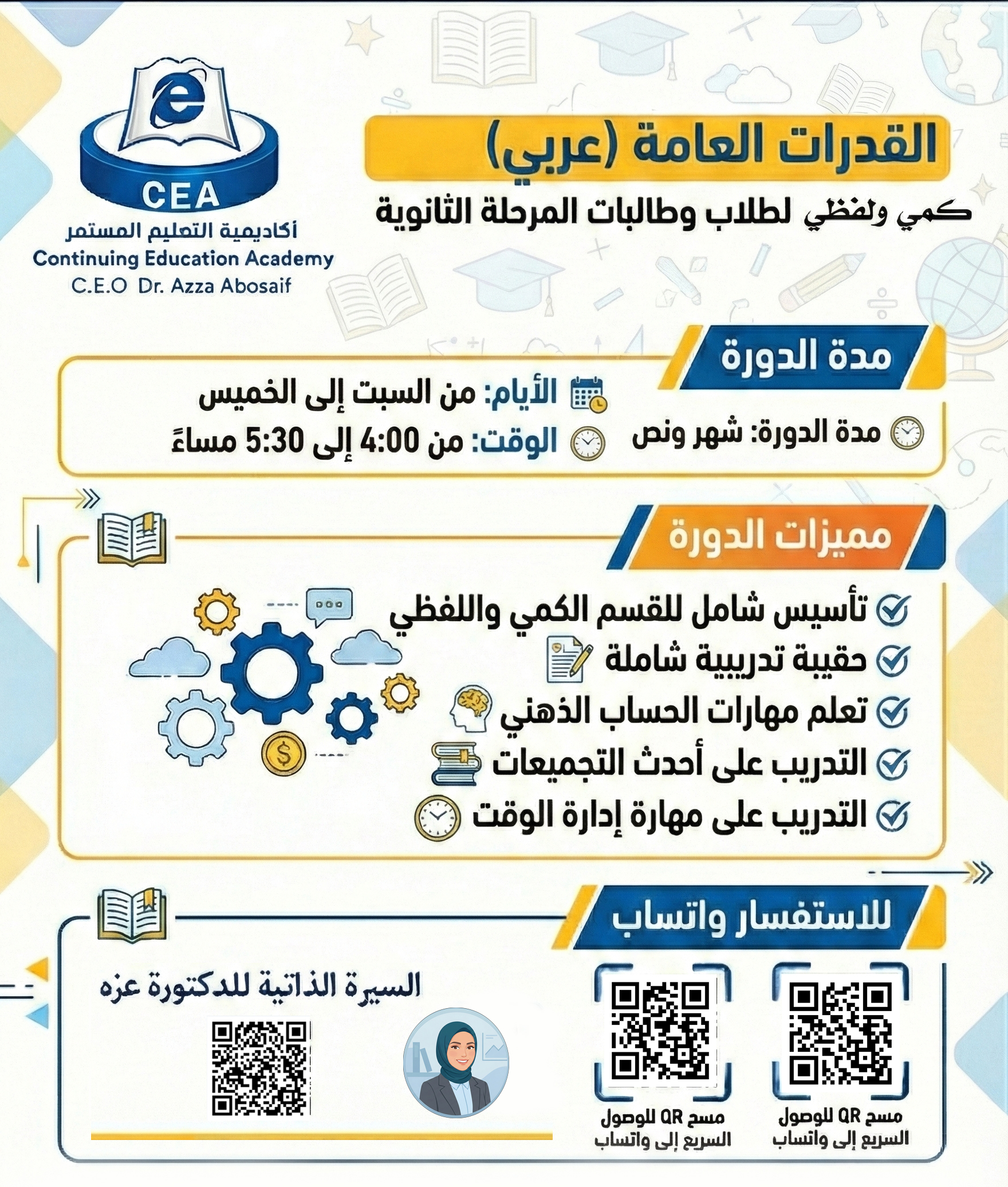 أؤمن أن التعليم ليس مجرد نقل للمعلومة، بل هو رسالة لبناء الإنسان وتيسير سبل النجاح. بدأت رحلتي منذ عام 1428هـ بشغف كبير لتمكين الطلاب والطالبات، ومن قلب التحديات ولدت "أكاديمية التعليم المستمر" لتكون شريكاً حقيقياً لكل طموح يسعى لاجتياز اختبارات المركز الوطني للقياس والرخصة المهنية بكل ثقة واقتدار.